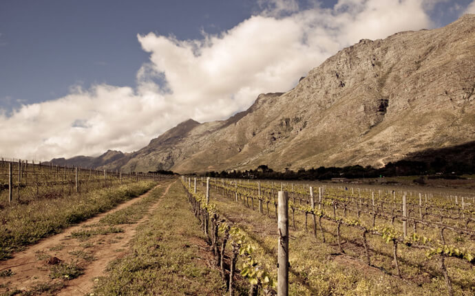 This prominent mountain rises nearly 1400 metres above sea level and forms a stark boundary between the wine-growing regions of Stellenbosch (to the south), Paarl (to the northeast), and Franschhoek (to the east). The vineyards are all planted on elevations ranging from 200 to 500 metres above sea level.